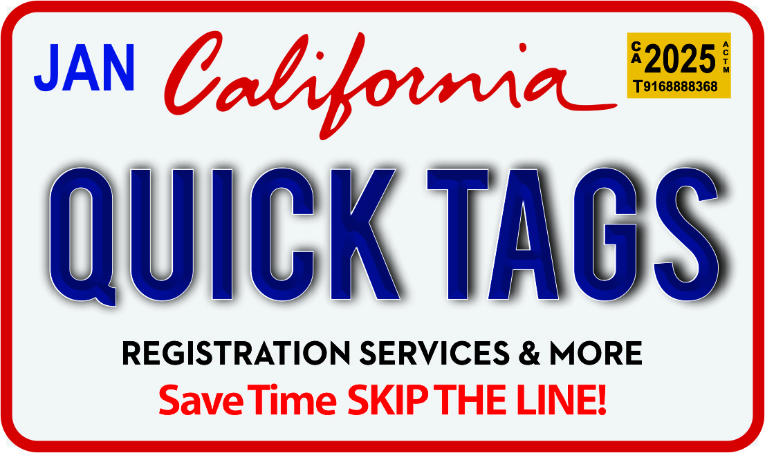 Welcome to QuickTags—California’s fast, friendly solution for all your vehicle tag and title needs. Skip the DMV lines and let our expert team handle your registration, title transfers, and renewals with speed and ease. At QuickTags, we believe in making your experience as smooth as possible. Our knowledgeable staff is here to answer your questions and guide you through every step, ensuring you get back on the road without delay.